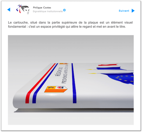 | Le graphisme s'organise autour de quatre éléments visuels essentiels : le cartouche, situé dans la partie supérieure met le titre en avant ; les rubans tricolores qui délimitent le sujet ; une typographie Sans Sérif, dépouillée de fioritures, incisive se prête bien à la brièveté d'un message informatif court et une palette de couleurs organisée autour du bleu, du blanc et du rouge pour rappeler l'univers couleur de la République française. Le tout est teinté d'une tonalité "Rétro" pour une allure contemporaine. Le graphisme, non seulement, le plus sophistiqué du marché mais aussi celui qui offre le niveau de personnalisation le plus élevé.